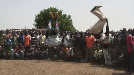 Les masques sont soutenus dans leur danse par un orchestre de tambours et par les encouragements du public.